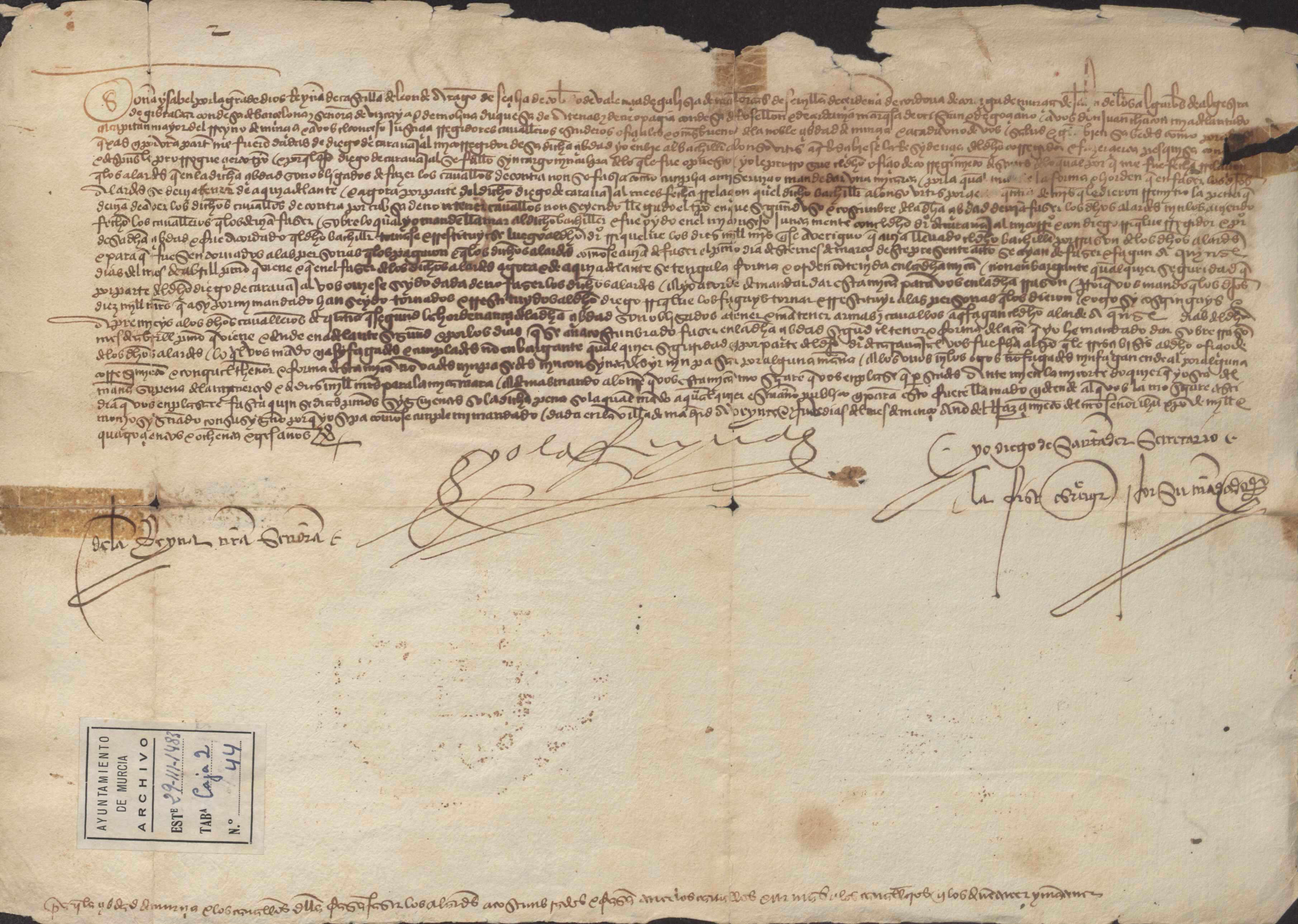 Isabel la Católica comunica al concejo de Murcia haber enviado a la ciudad al bachiller Alfonso Ortiz a investigar ciertas quejas existentes contra el corregidor Diego de Carvajal por causa de no convocarse los alardes como estaba estipulado. Igualmente, ordena al concejo la devolución de los 10.000 maravedís que los caballeros de cuantía habían entregado al dicho Alfonso Ortiz para no acudir a los alardes, y ordena que sean obligados a mantener caballo y armas, convocándose los alardes de la manera acostumbrada.