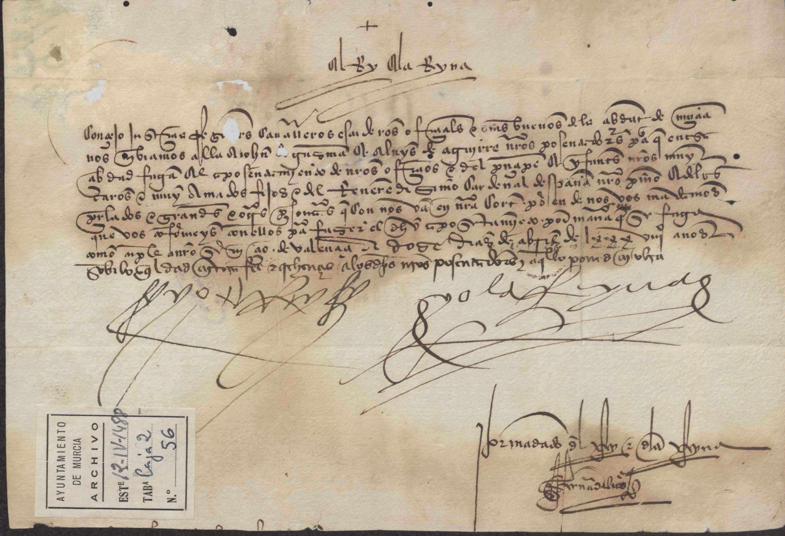 Los Reyes Católicos anuncian al concejo de Murcia la llegada de los aposentadores Juan Guzmán y Luis de Aguirre, para que la ciudad prepare el alojamiento de los oficiales, príncipe, infantes, cardenal de España y otras personas de la corte que han de acudir a Murcia.