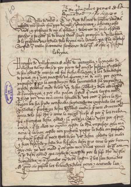 Isabel la Católica comunica al provisor de Villafranca, Alfonso de Quintanilla y al licenciado de Illescas, oficiales del Consejo Real, quiten a la ciudad de Murcia la obligación de pagar un cuento y medio de maravedís en concepto de penas impuestas por la Hermandad, dada la pobreza y los muchos trabajos y fatigas ocasionados por los problemas con el río.