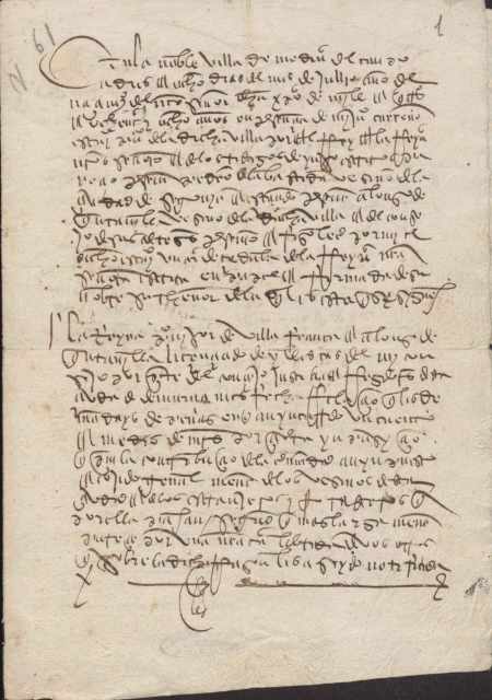 Isabel la Católica comunica al provisor de Villafranca, Alfonso de Quintanilla y al licenciado de Illescas, oficiales del Consejo Real, quiten a la ciudad de Murcia la obligación de pagar un cuento y medio de maravedís en concepto de penas impuestas por la Hermandad, dada la pobreza y los muchos trabajos y fatigas ocasionados por los problemas con el río.