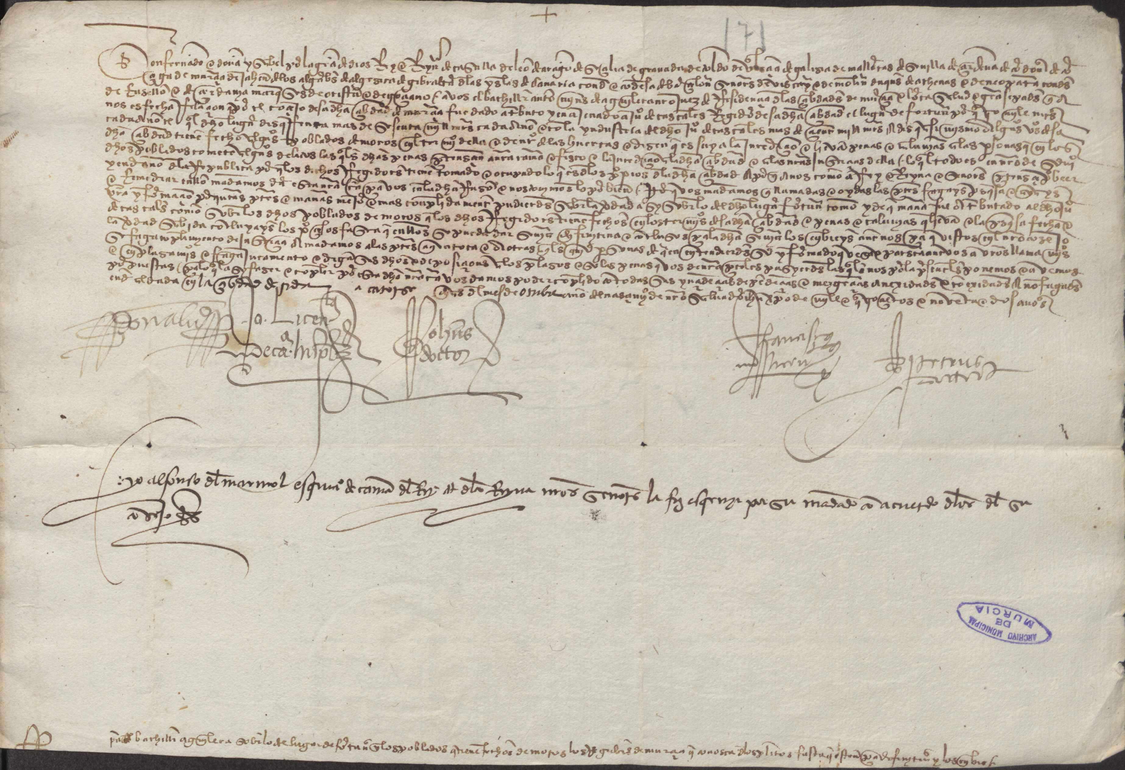 Los Reyes Católicos ordenan a Antón Martínez de Aguilera, juez de residencia en Murcia, las circunstancias de la enajenación al regidor Juan de Cascales del lugar de Fortuna, así como el hecho de que algunos regidores de la ciudad posean poblados de moros en la huerta, sobre los cuales ejercen su propia jurisdicción, usurpando así la del concejo.