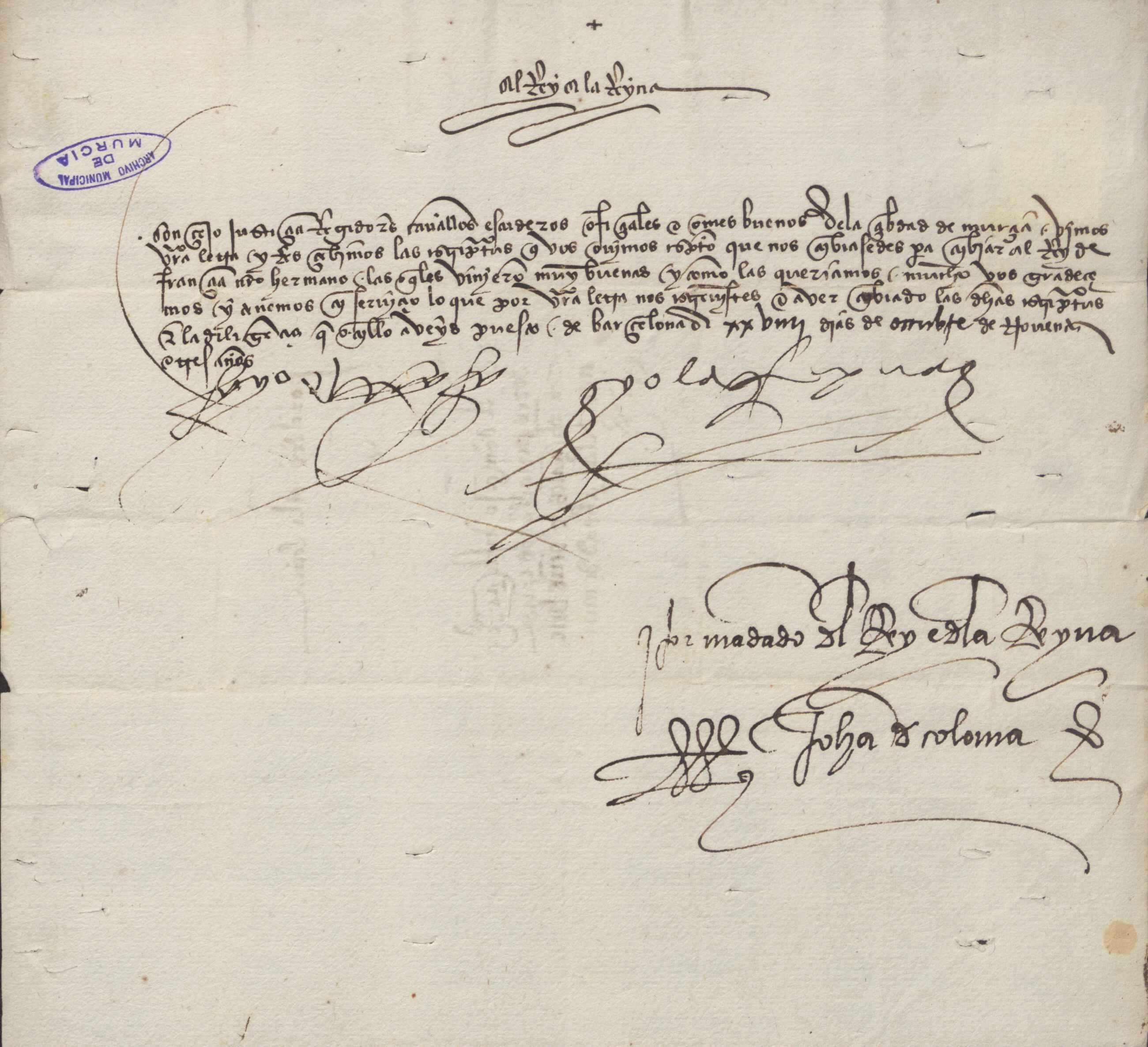 Carta misiva de los Reyes Católicos confirmando a Murcia haber recibido las cartas que la ciudad había enviado al rey de Francia.