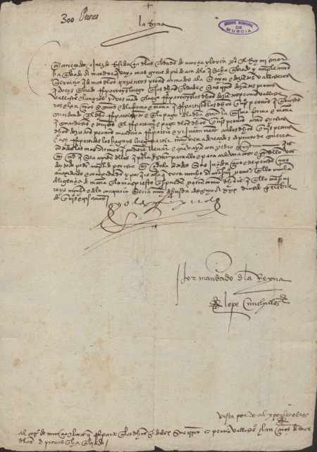 Carta misiva de Isabel la Católica al corregidor de Murcia ordenando sumar 200 peones más a los 500 que han de enviarse a la guerra contra Francia.