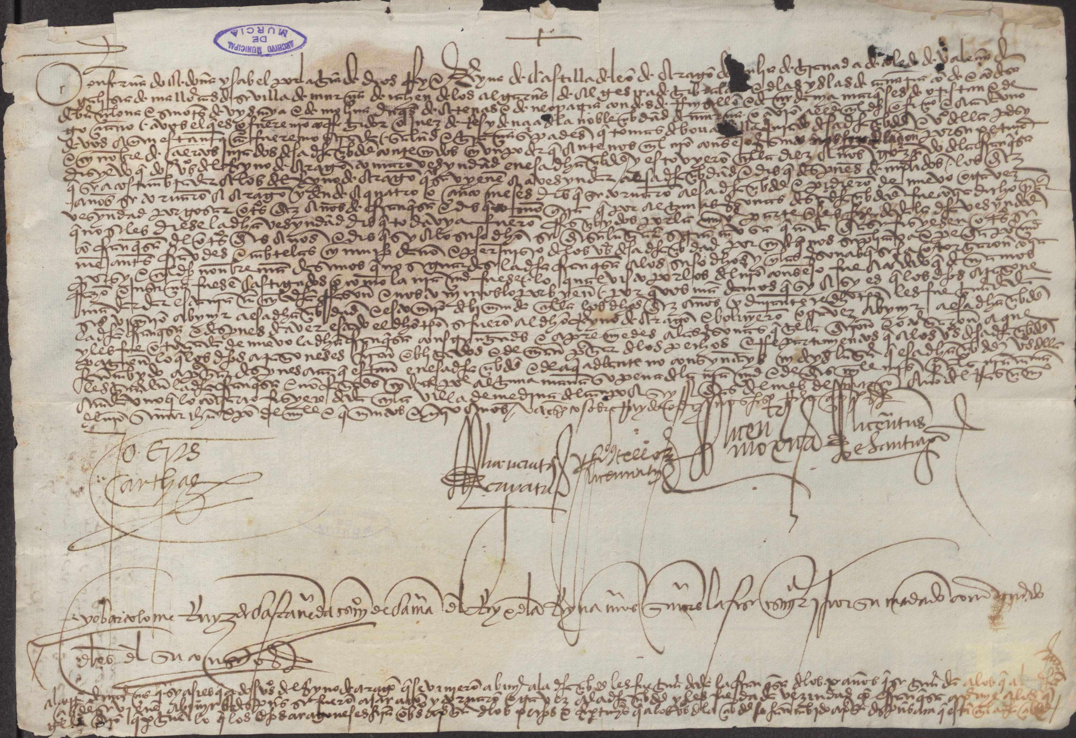 Provisión de los Reyes Católicos al corregidor de Murcia ordenando no guardar la franqueza a aquellos aragoneses que volviesen de nuevo a establecerse en Murcia.