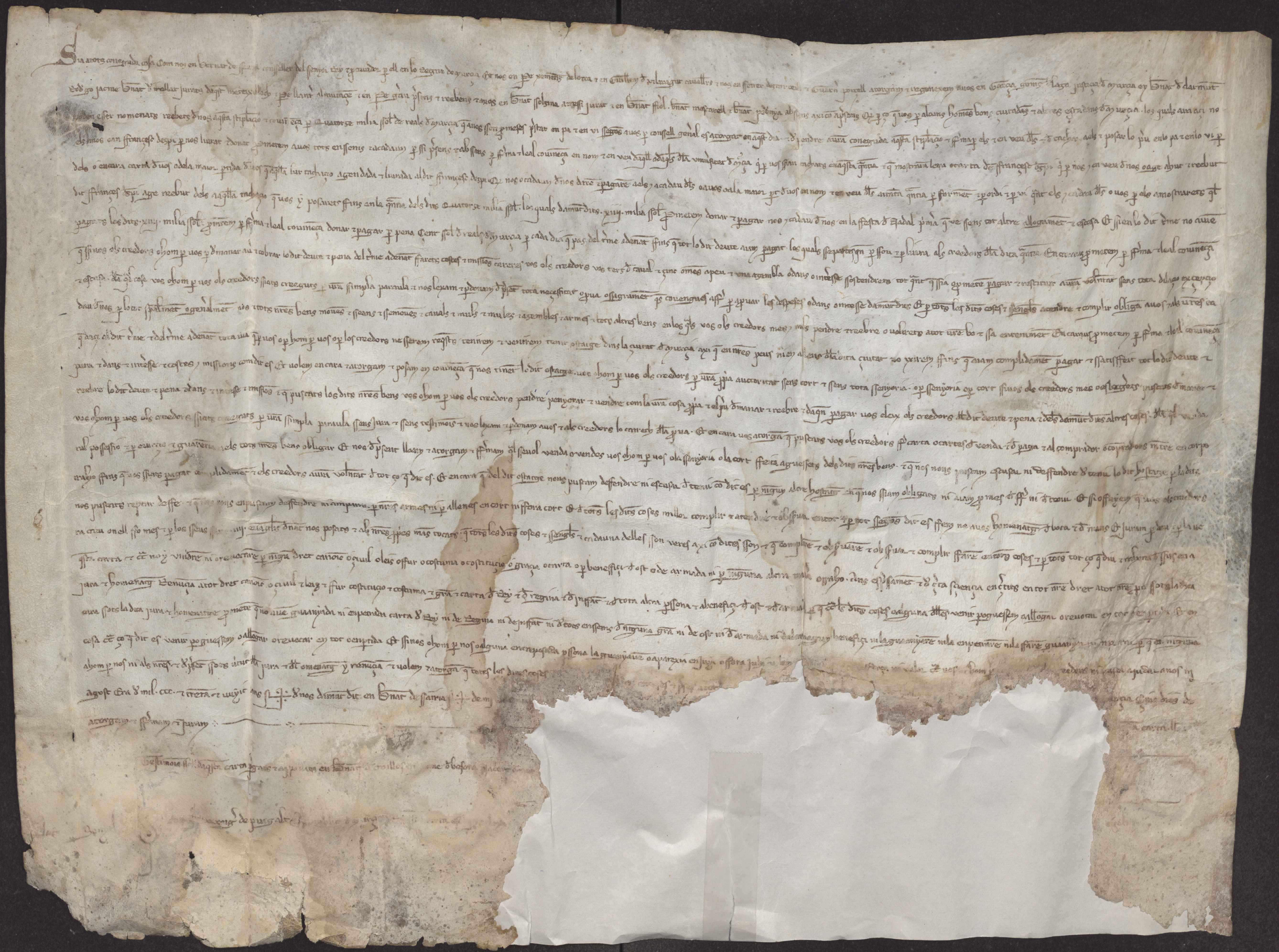Bernardo de Sarriá, procurador general del Reino de Murcia, y otros caballeros de Aragón, reconocen haber recibido del concejo y vecinos de Murcia cereales y vino por valor de 14000 sueldos. Se comprometen a pagarlos antes de la fiesta de Navidad y para ello obligan sus bienes, incluidos los caballos y armas, y prometen residir en la ciudad como rehenes hasta que la deuda sea pagada.