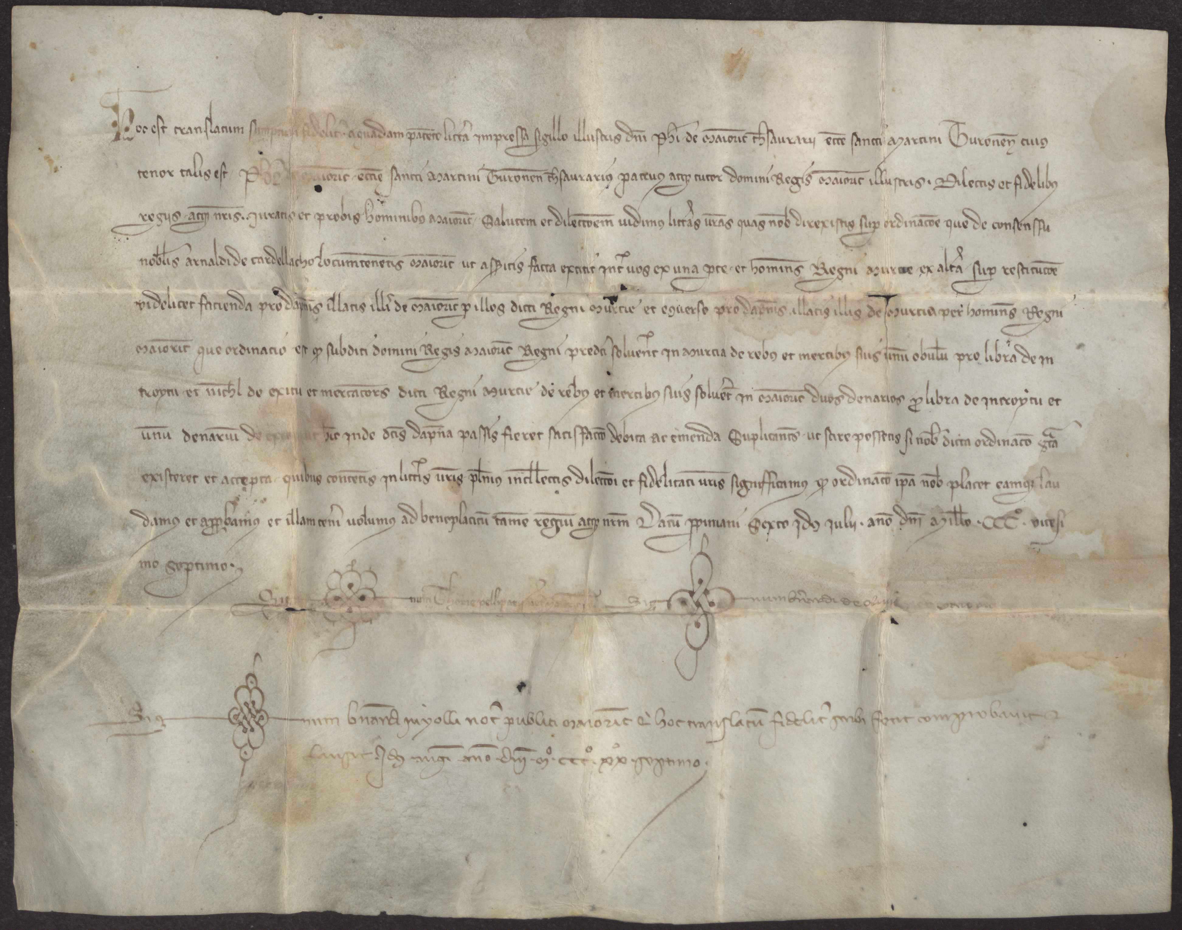Felipe de Mallorca, tesorero de la iglesia de San Martín de Tours y tutor del rey de Mallorca [Jaime III] aprueba el acuerdo establecido entre los concejos de Mallorca y Murcia para cobrar un impuesto sobre las mercancías a los comerciantes de Mallorca y Murcia hasta satisfacer a los damnificados de ambos reinos.
