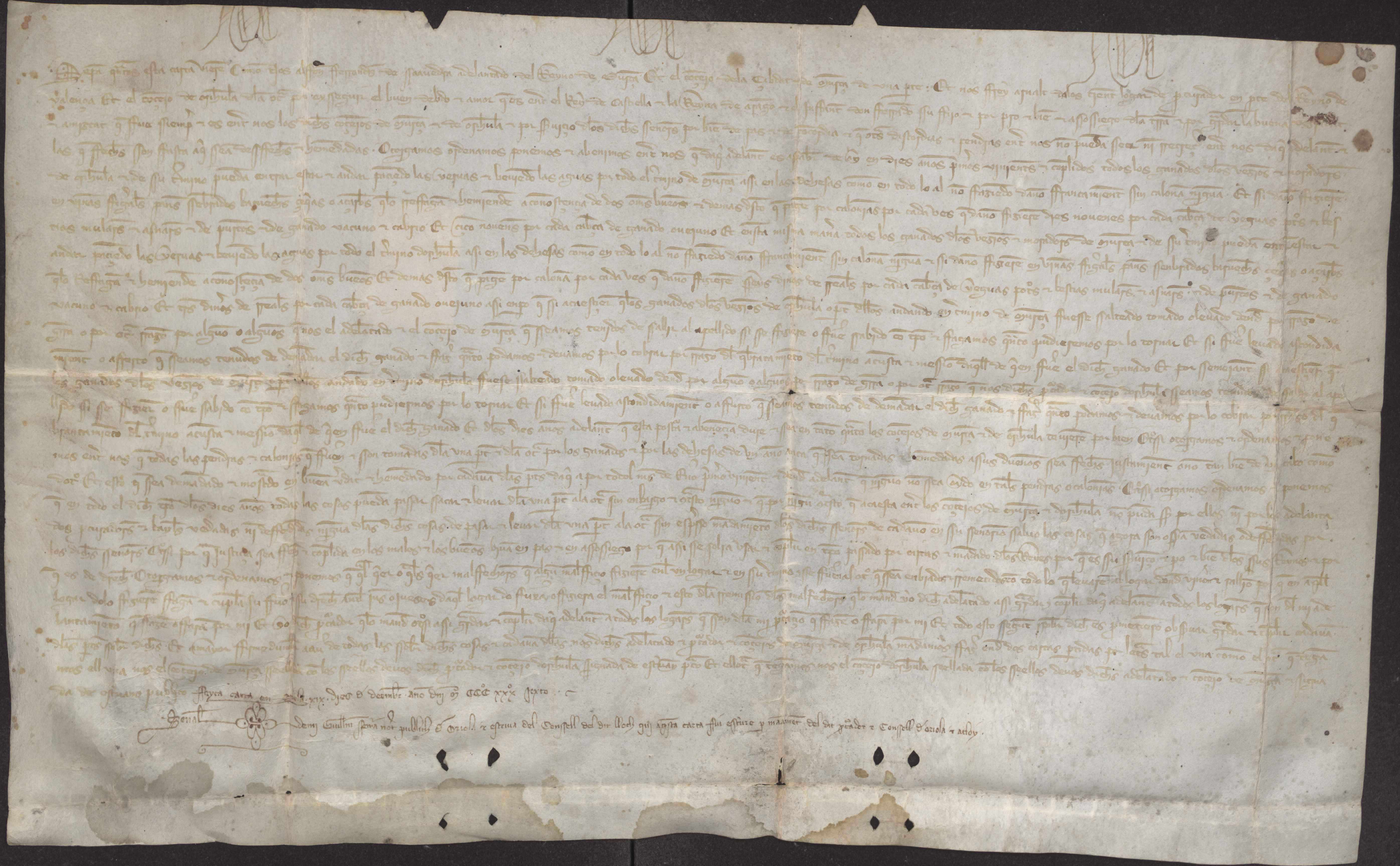 Alfonso Fernández de Saavedra, adelantado de Murcia, y el concejo de Murcia por una parte, y Fray Arnalt Dalos, lugarteniente de procurador en el reino de Valencia, y el concejo de Orihuela por otra parte acuerdan: a) libertad de pasto para los ganados en ambos términosb) que los vecinos puedan pasar y sacar las cosas de un término a otro sin ser embargados, salvo las cosas vedadasc) acuerdo de extradición de malhechoresEl acuerdo durará diez años