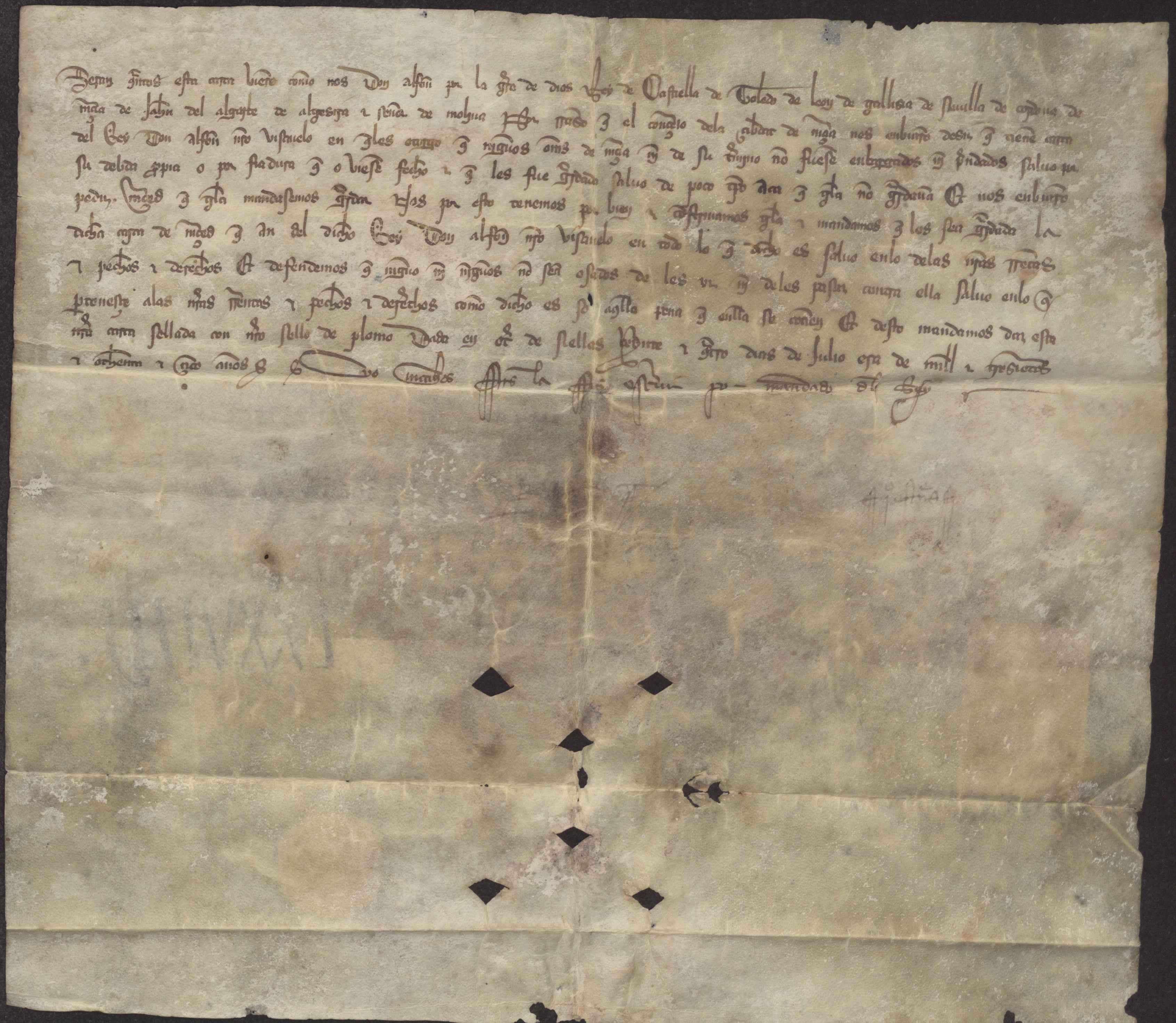Carta plomada de Alfonso XI confirmando privilegio de Alfonso X sobre la realización de embargos a los vecinos de Murcia