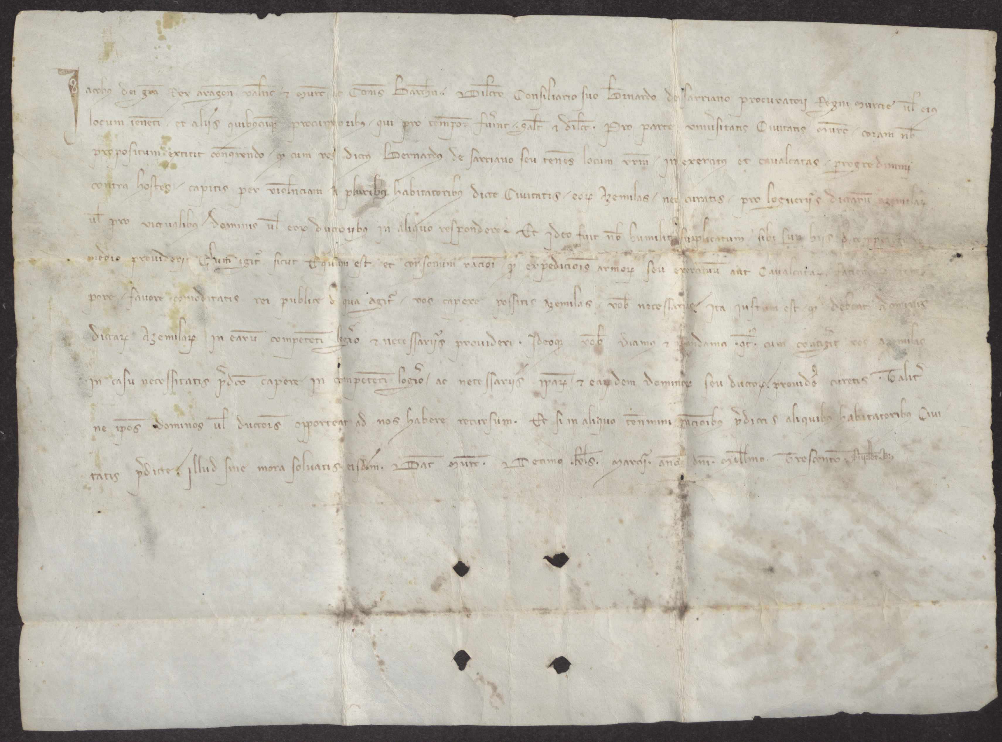 Jaime II ordena a Bernardo de Sarriá, su procurador en el Reino de Murcia, que cuando se tomaran acémilas a los vecinos de Murcia para la guerra y cabalgadas, se les abonara el adecuado alquiler