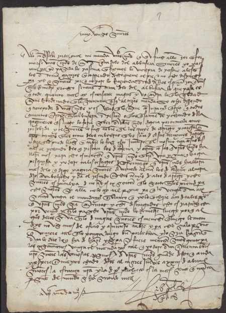 Alfonso Sánchez de las Doncellas comunica haber visitado, junto a Pedro Pacheco la zona del Mar Menor, y comprobado que no se cumple la carta de los reyes concediendo toda la pesca de esa zona a la ciudad de Murcia. Recomienda por tanto el envío de una persona que haga las pesquisas pertinentes y lleve adelante el pleito con la ciudad de Cartagena. Fechada el 23 de abril.