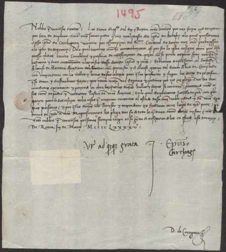 El recién nombrado Obispo de Cartagena comunica al concejo de Murcia su traslado desde el Obispado de Badajoz al de Cartagena, por el traslado de su predecesor al de Sigüenza. Manda para ello a Alonso de Mariana y a Alonso García del Rincón, provisor y mayordomo del obispado, para que acudan a Murcia con las bulas papales y cartas reales que hacen efectivo dicho nombramiento y para que preparen los actos correspondientes a su llegada.