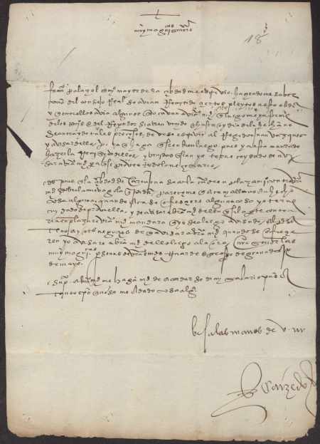 Rodrigo de Caizedo, que se encuentra en la Chancillería de Granada, responde al concejo de Murcia sobre ciertos asuntos que le han sido requeridos: el envío de ciertos pleitos referentes a la ciudad y algunos de los miembros del concejo, la construcción de la gola en Cartagena, y pide que se ponga al día su salario como corresponde. Fechada el 9 de mayo.