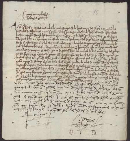 Alfonso Sánchez de las Doncellas se dirige al concejo de Murcia para comunicar que ciertos pescadores de Cartagena están faenando en aguas del Mar Menor, que corresponden al término de Murcia, y además se dedican a vender el pescado al Reino de Aragón, no queriendo dar nada a los vecinos de Murcia. Pide por tanto justicia y se cumpla la orden por la cual estas aguas pertenecen a la ciudad de Murcia. Fechada el 8 de abril.