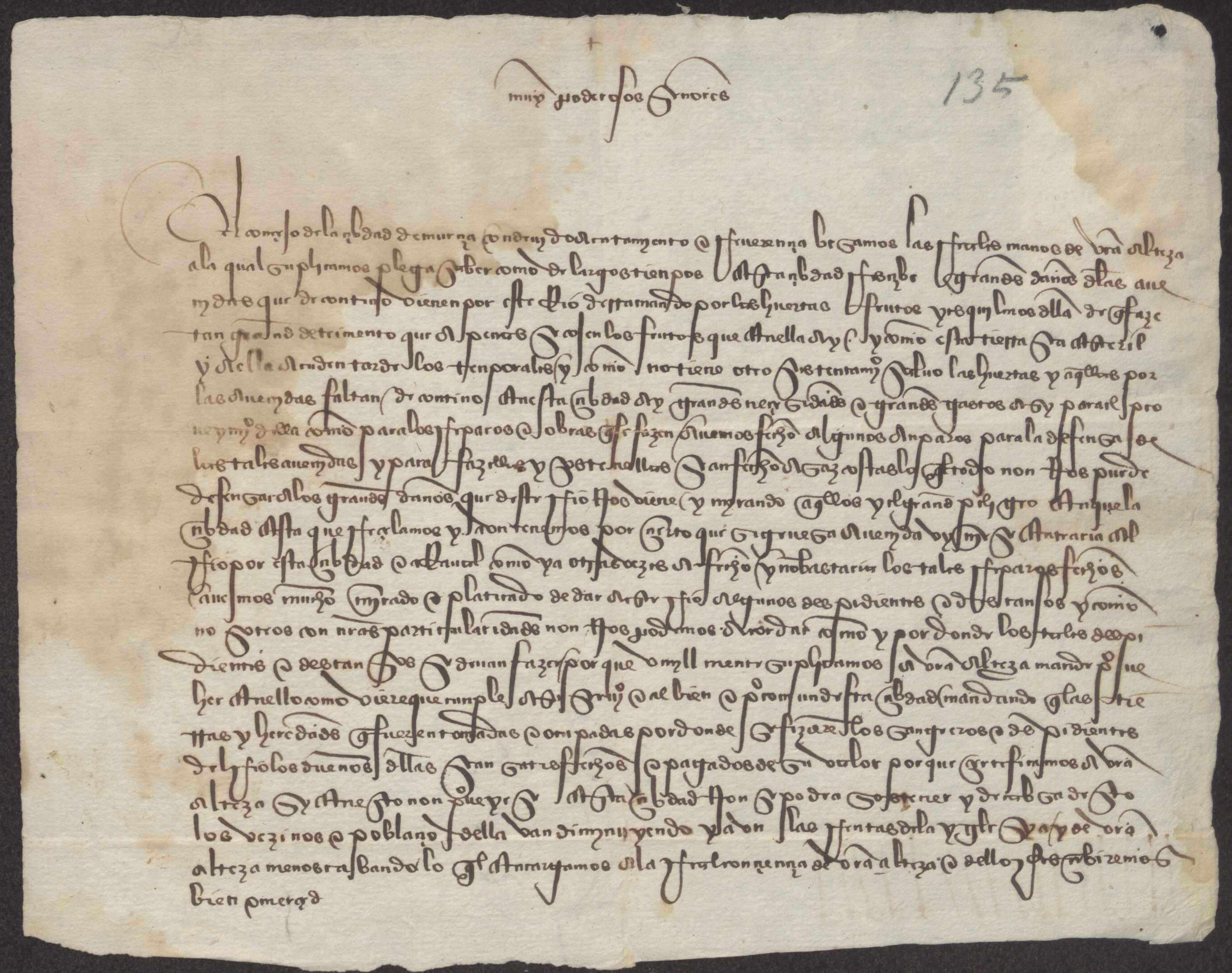 Minuta de una carta del Concejo de Murcia al rey, pidiendo ayuda para la realización de obras para paliar los efectos de las riadas.