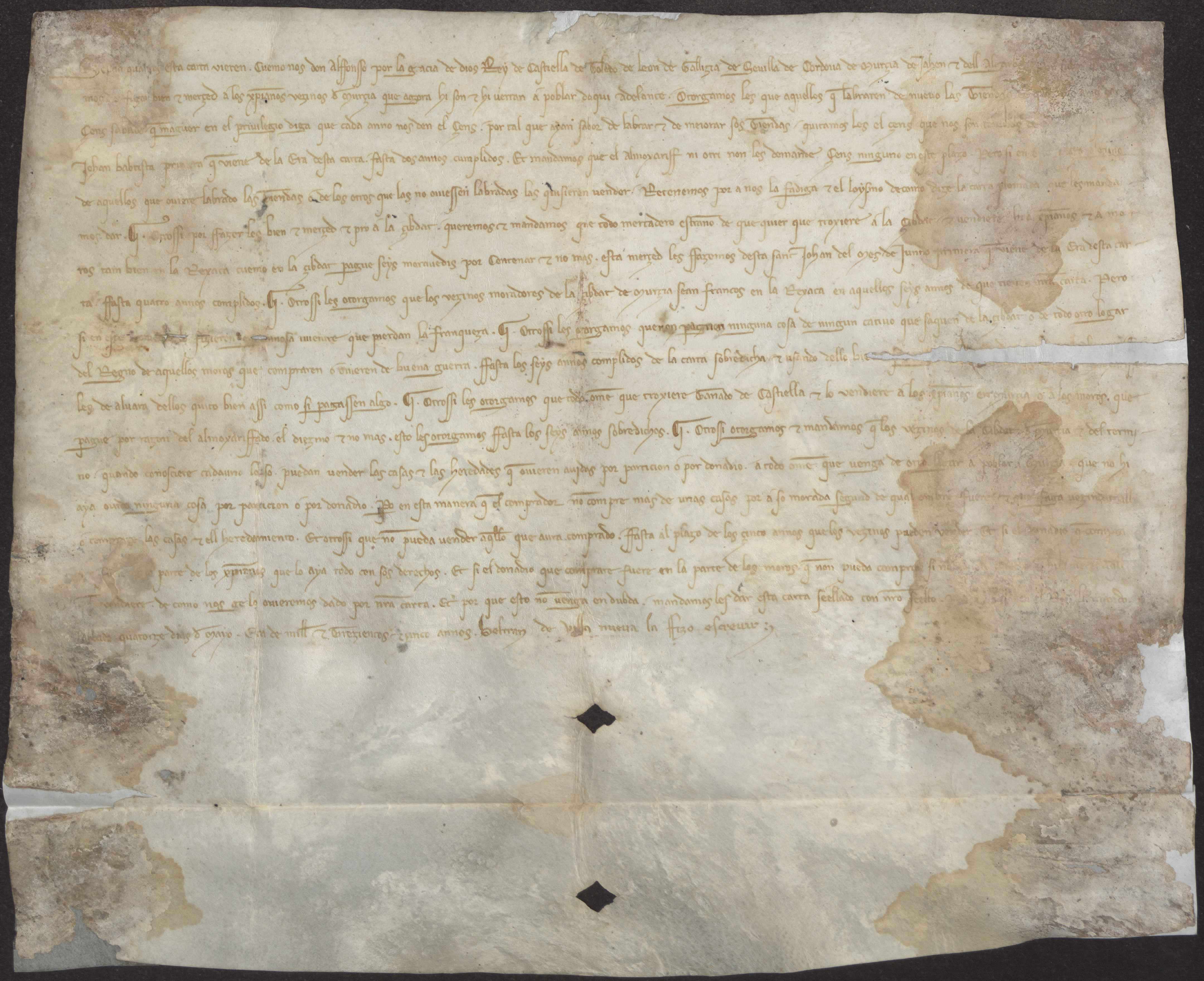 Alfonso X concede varias mercedes para estimular la repoblación de la ciudad de Murcia: exención en el pago de censos de las tiendas por dos años; los mercaderes extraños que introduzcan mercancías pagarán un 6% de impuesto durante 4 años; los vecinos de Murcia serán francos en la Arrixaca durante 6 años; los vecinos de Murcia podrán sacar los cautivos moros de la ciudad sin pagar impuestos durante 6 años; el ganado introducido desde Castilla pagará por almojarifazgo el 10%; regula la compraventa de casas en la ciudad.