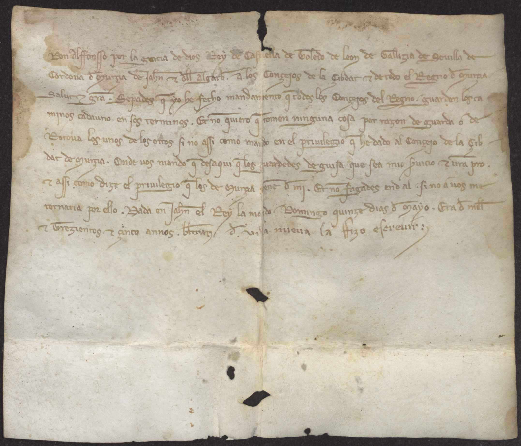 Alfonso X ordena a todos los concejos del Reino de Murcia que guarden los caminos de sus respectivos términos y prohibe que se cobre por ello tributo alguno.
