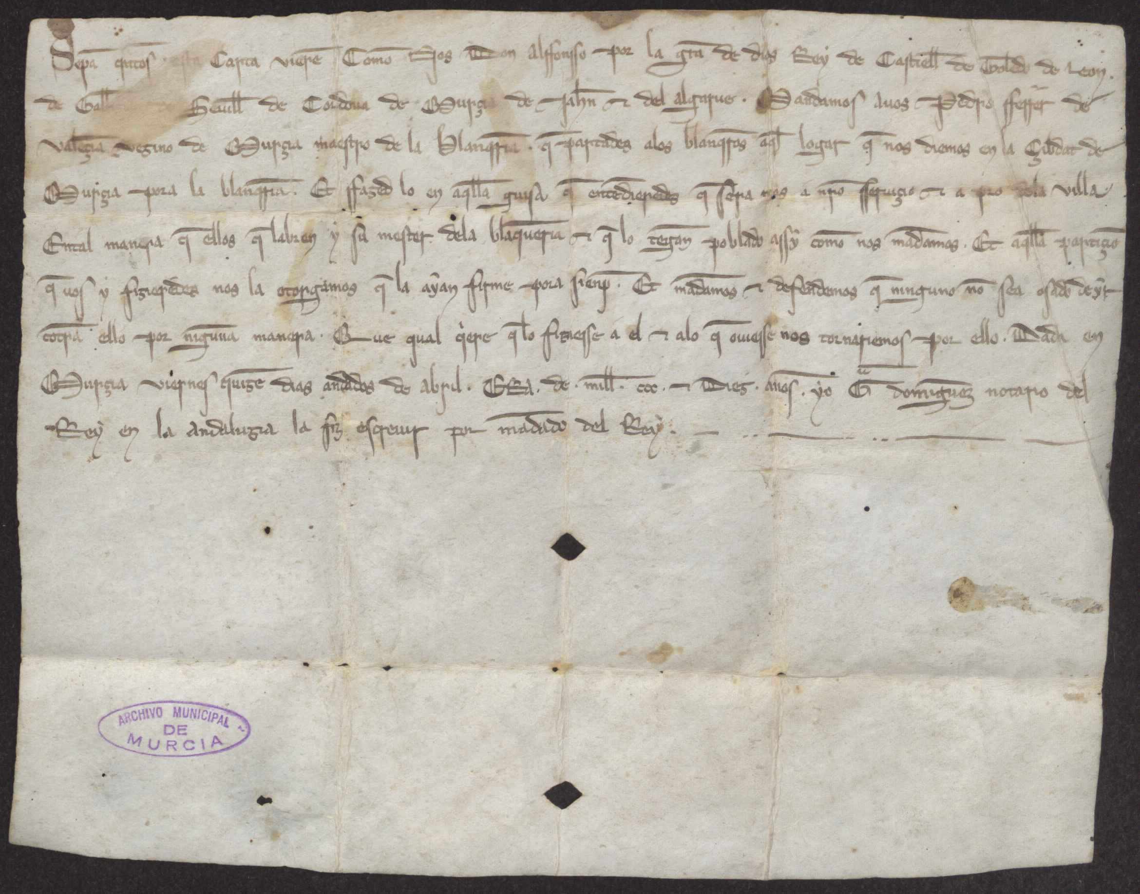 Alfonso X manda a Pedro Ferrer de Valencia, maestro de la blanquería, que parta entre los de su oficio el lugar que dio para blanquería en Murcia.