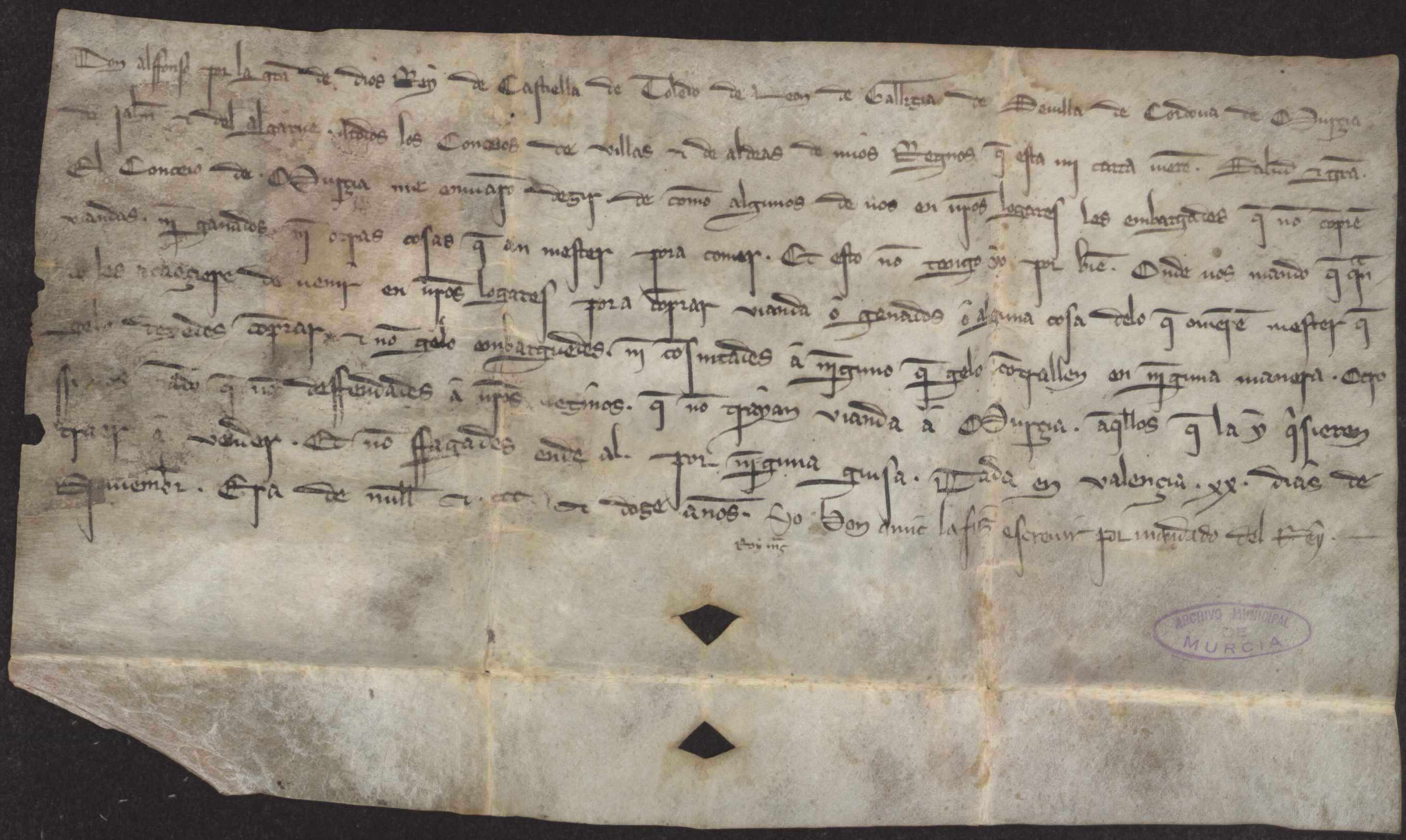 Alfonso X ordena a los concejos de su reino que permitana los vecinos de Murcia comprar víveres y ganados en sus términos para su abastecimiento.