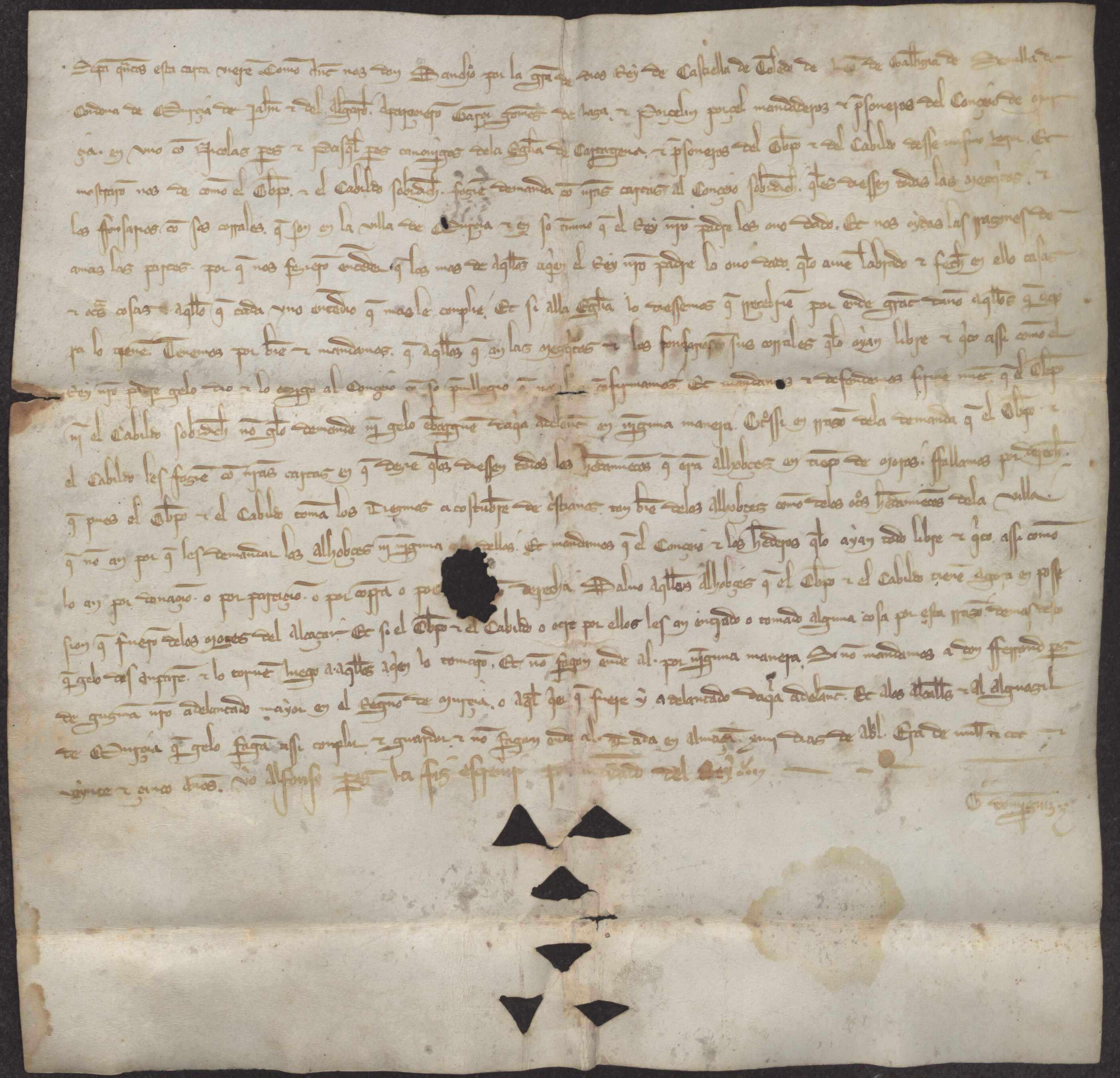 Sancho IV confirma al concejo de Murcia, a petición de sus personeros, la posesión de las mezquitas y los alhoces de Murcia que le fueron otorgados por Alfonso X. Ordena al Cabildo y al Obispo de la Iglesia de Cartagena que no les demanden ni embarguen dichos bienes y que sólo tomen el diezmo de aquellos alhoces que tienen en posesión y que pertenecieron a los moros del alcázar.
