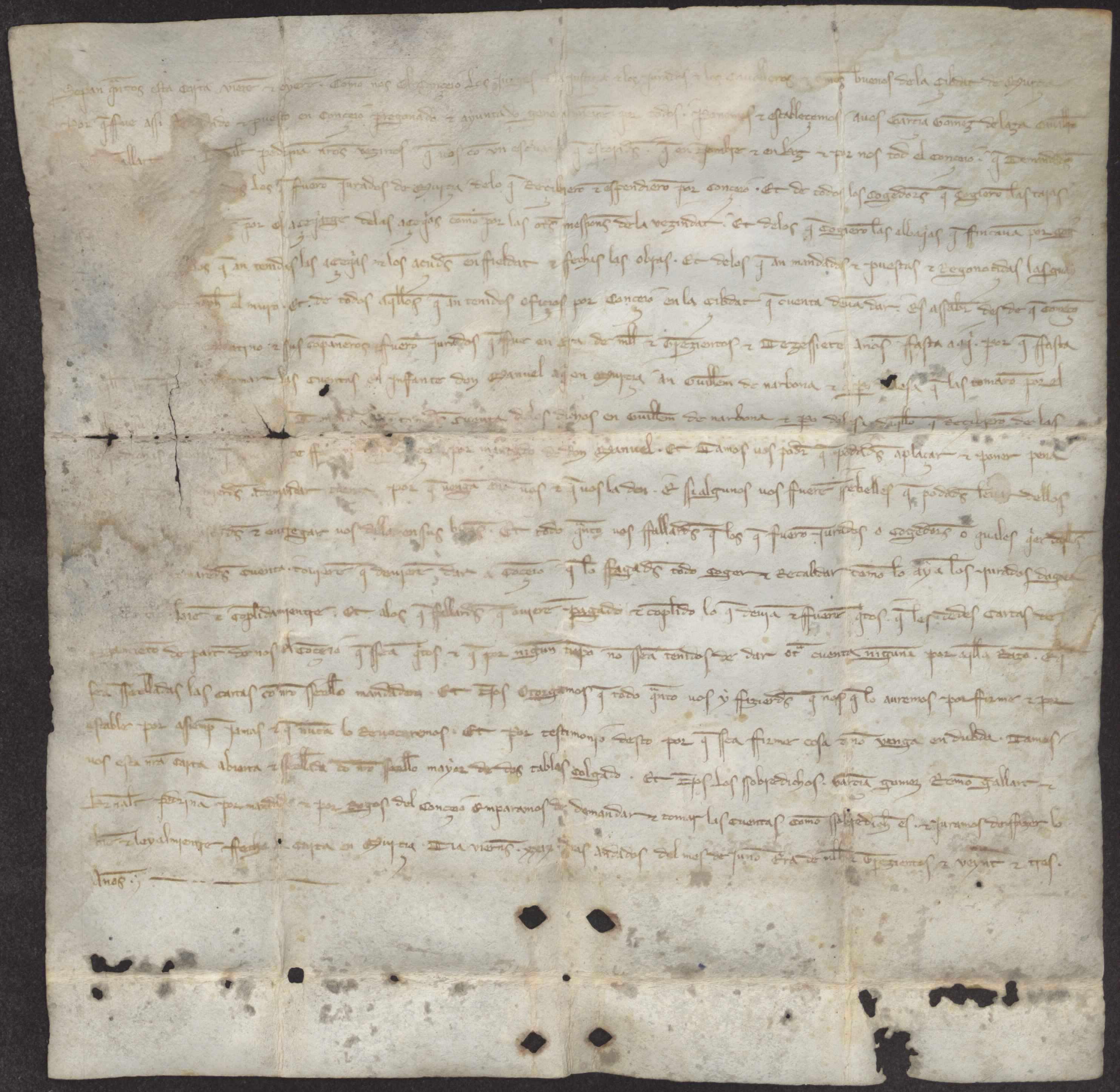 Carta de poder del concejo de Murcia a García Gómez de Laza, Ramón Gallart y Guiralt Pedriñán para revisar las cuentas de los jurados y cogedores de los cinco años anteriores.
