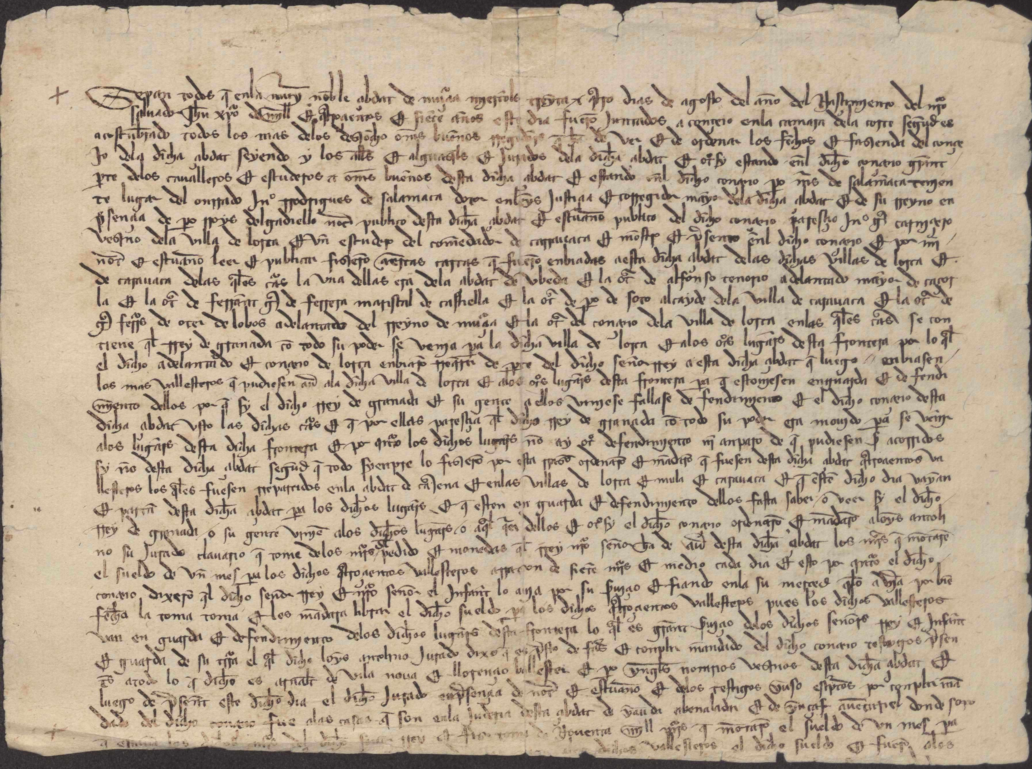 Testimonio de la presentación ante el concejo de Murcia de cinco cartas, envidas por el concejo de Lorca, el alcayde de Caravaca, el mariscal de Castilla y los adelantados de Murcia y Cazorla, que avisan de una posible invasión del rey de Granada, y piden el envío de tropas a la frontera. El concejo acuerda por tanto enviar 400 ballesteros a Lorca, Cartagena, Mula y Caravaca, y autoriza a Luis Antolino, jurado clavario, a tomar dinero del pedido y la moneda para pagar dichas tropas.